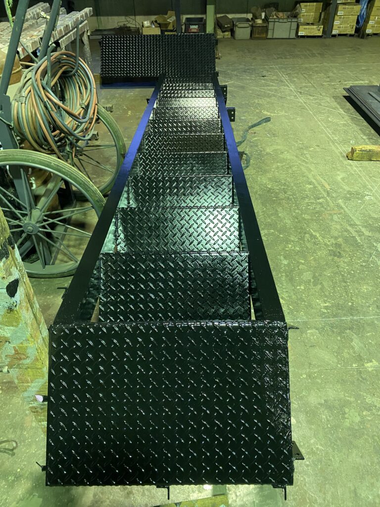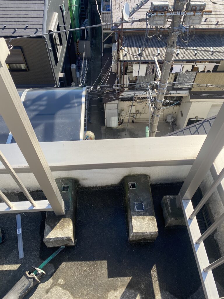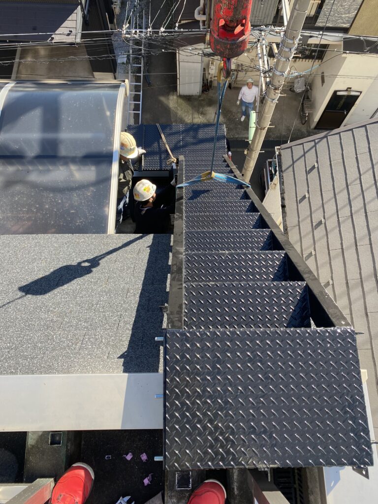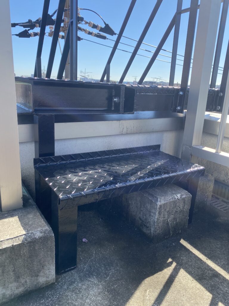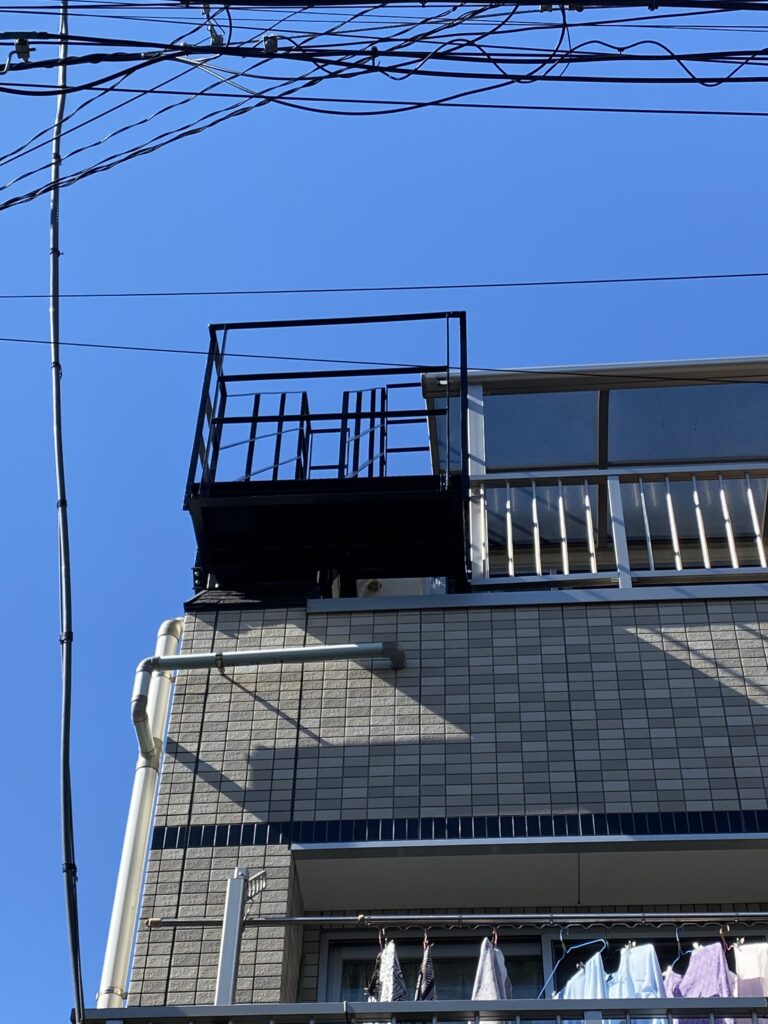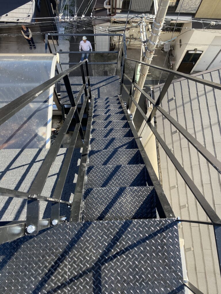 オーナー様からの要望で既存がスペースがなくタラップでしたが屋上に上がるのに安心して上がりたいということなのでセットバックに沿って階段を製作、工場塗装、取り付け、取り付け後のタッチアップまでいたしました。