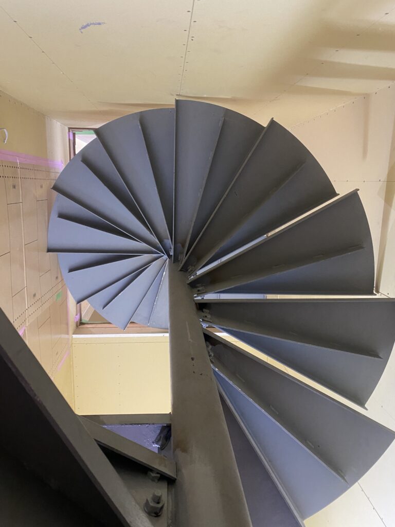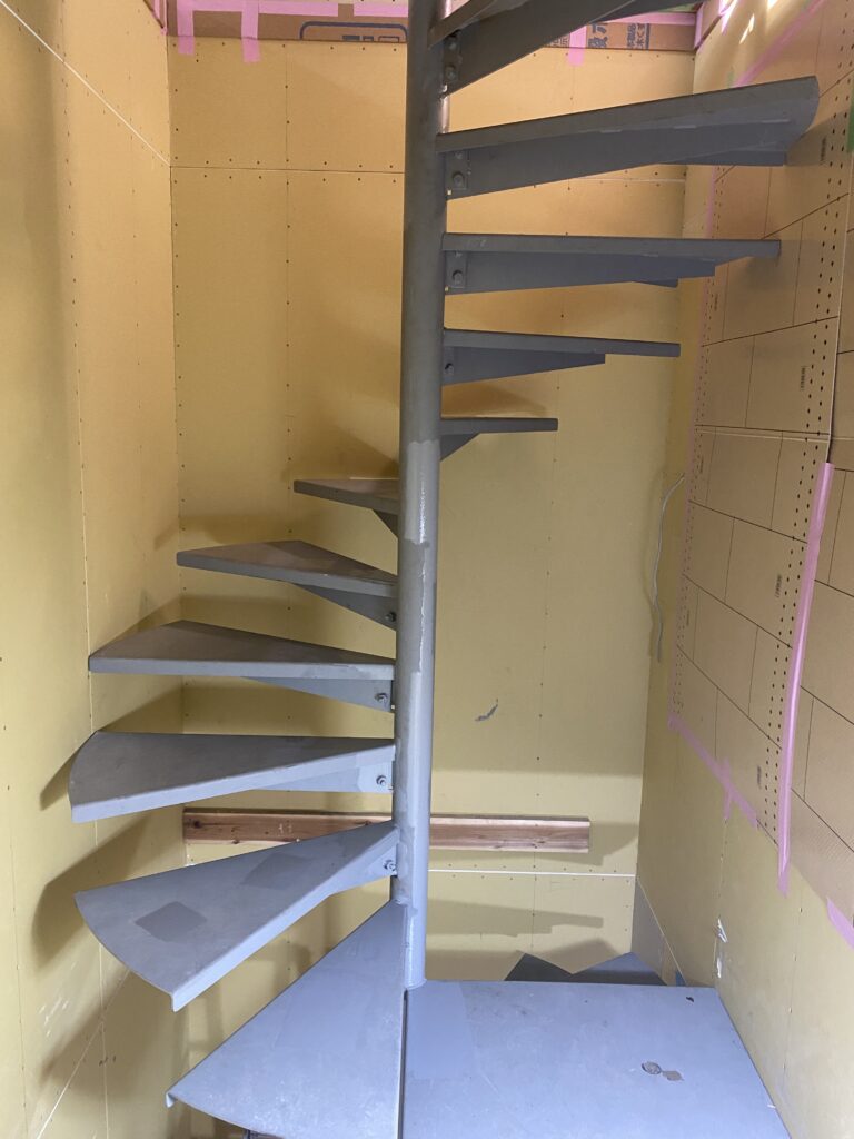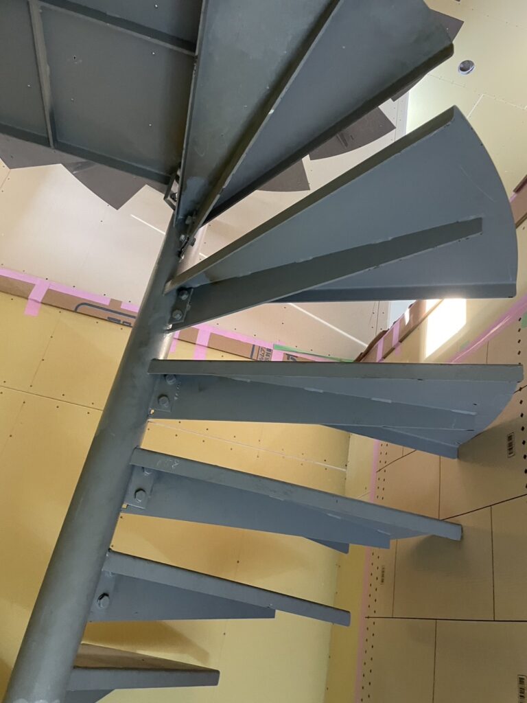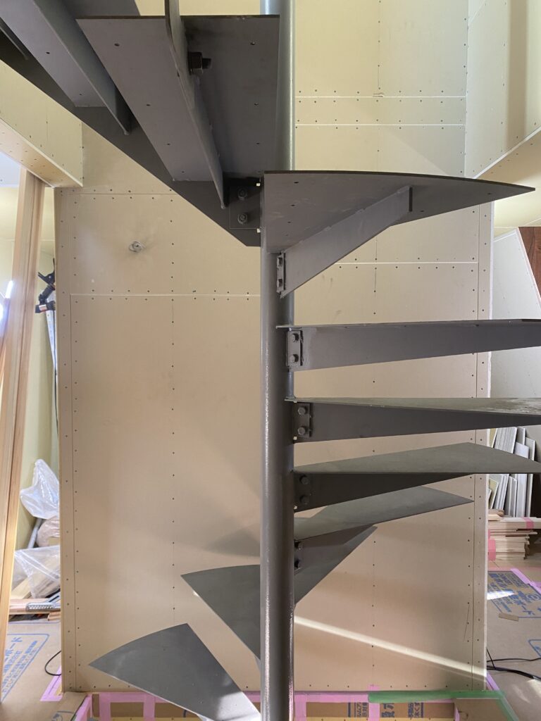 1F~4Fまでの螺旋階段の取付は室内の床、サッシなど溶接作業なので焦がさないように慎重に取付いたしました。